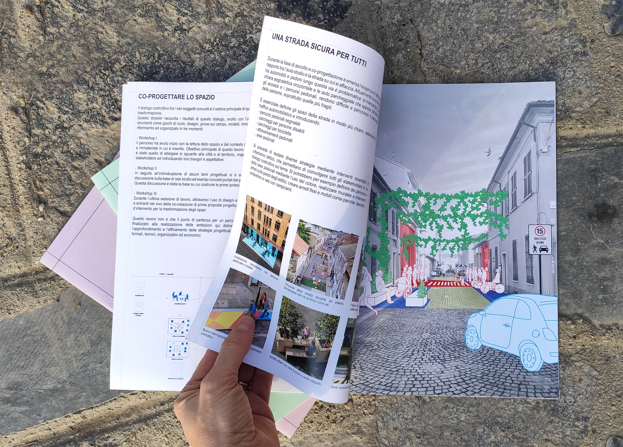 I risultati di questo percorso di accompagnamento sono raccolti nei Quaderni di progettazione partecipata. Questi dossier documentano il processo di dialogo tra i vari soggetti coinvolti, utilizzando strumenti come giochi di ruolo, disegni, sperimentazioni pratiche, modelli e immagini di riferimento. Il percorso è stato strutturato in tre fasi: analisi dello spazio e del contesto, discussione basata su casi studio ed esempi concreti, e co-creazione delle prime proposte progettuali e strategie d’intervento per la trasformazione degli spazi.