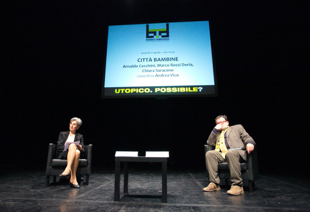 In un’utopia possibile di una città intelligente, ecologica e partecipata, i bambini e i ragazzi sono cittadini attivi, portatori di conoscenza e indicatori di una nuova qualità urbana; su questo tema si è sviluppata la conferenza Città bambine, un confronto a più voci tra Arnaldo Cecchini, professore ordinario di Tecniche urbanistiche e Direttore del Dipartimento di Architettura, design e urbanistica dell’Università di Sassari, Marco Rossi Doria, sottosegretario del Ministero dell’Istruzione, dell’università e della ricerca del Governo Monti, e Chiara Saraceno, sociologa e honorary fellow Collegio Carlo Alberto di Torino. La conferenza, curata insieme a ITER, è stata moderata dal giornalista Andrea Vico.